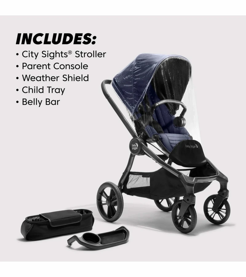 - Includes City Sights® Stroller, Parent Console, Weather Shield, Child Tray and Belly Bar