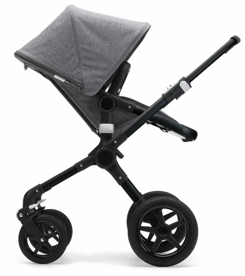 Bugaboo has given the exterior a contemporary makeover by refreshing the color range and fabric. All the outer fabric is now certified responsible and available in Dark Navy and Grey Mélange. Other details include the black faux leather handlebar and carry handle and black wheel caps.