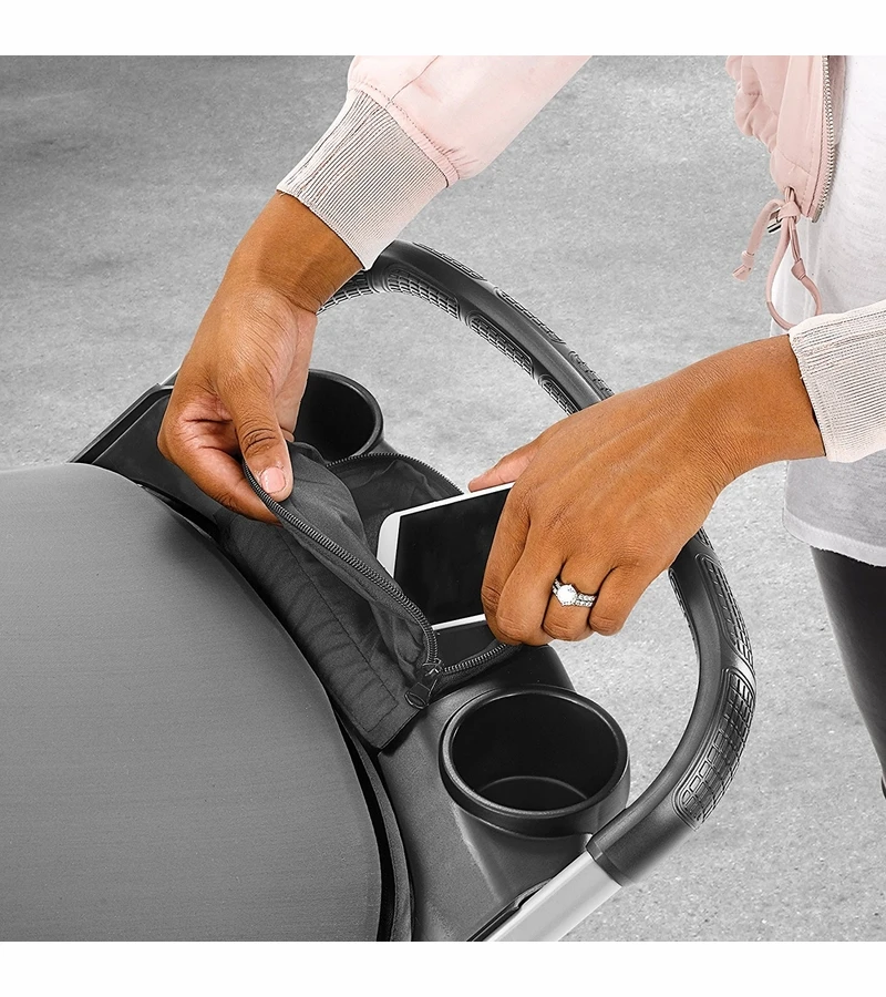 Thoughtful design offers a smooth ride with swivel wheels and secure parking with toe-tap brakes. An easy-grip handle and parent tray with two cup holders and zippered storage put comfort and convenience at your fingertips. A large basket stows must-haves down below. A detachable child tray, 3-position backrest, and adjustable canopy with mesh extension panel help make every ride more comfortable.
