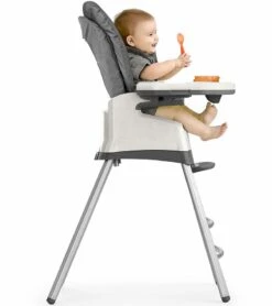 In its first mode, the Stack® offers all the convenience of an everyday highchair with a wipeable seat pad, five-point harness, removable tray, and three recline positions. As baby grows into a toddler, the highchair seat is easy to detach from its frame to create a high-back booster that secures to a dining chair for meals with the tray or at the table. Rubberized, pop-out feet for the booster help protect chairs. For older children, the highchair frame can be used as a stool with a contoured seat and pop-up backrest.