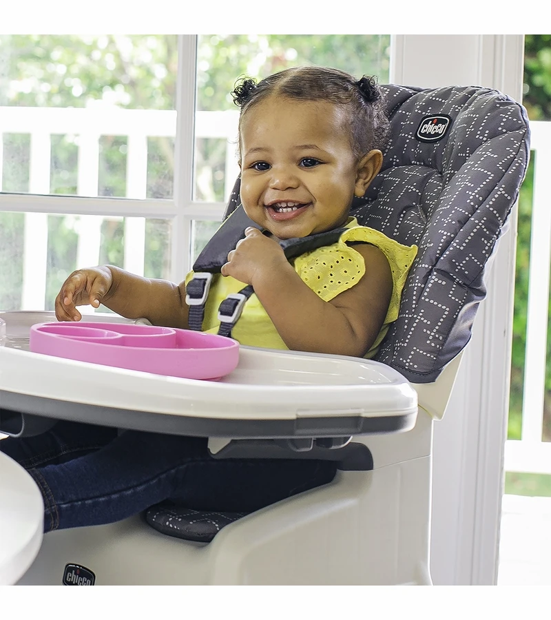 - Padded, 5-point harness for highchair and booster