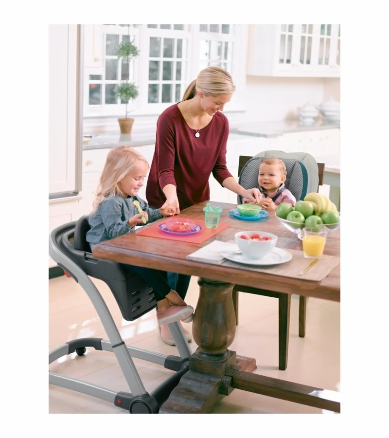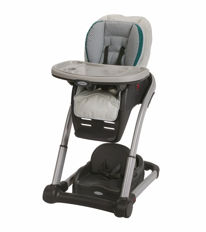 Graco Blossom 4-in-1 Seating System- designed to adjust to your growing childs seating needs and to accommodate more than one child in your growing family. It transforms seamlessly from an extremely functional highchair to an infant feeding booster, a toddler booster, and finally a youth chair. Should your family suddenly grow, it can even accommodate a baby and a toddler at the table all at once. The 6-position height adjustment assures a front row seat for baby at any family table. And the 3-position removable footrest and 3-position one-hand reclining seat will ensure your growing child stays comfortable at mealtime.