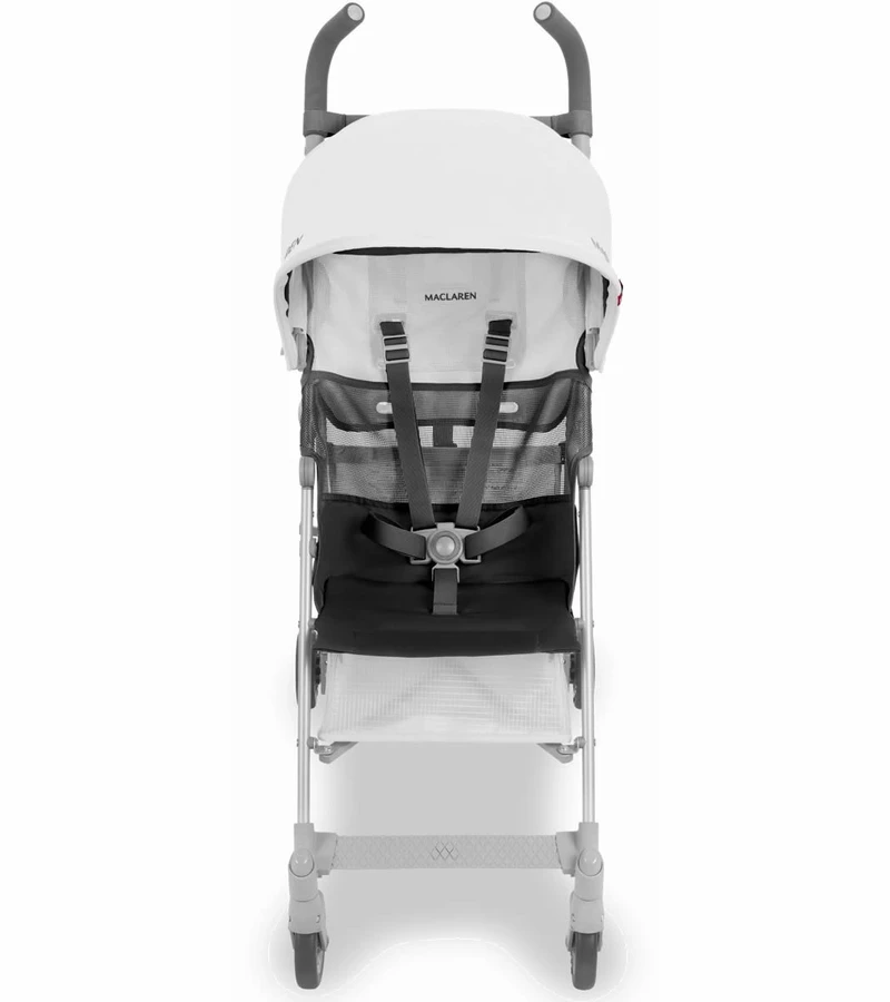 Five safety straps securely mounted to our aluminum frame mated with our exclusive two-finger release buckle making every Maclaren the safest seat around.