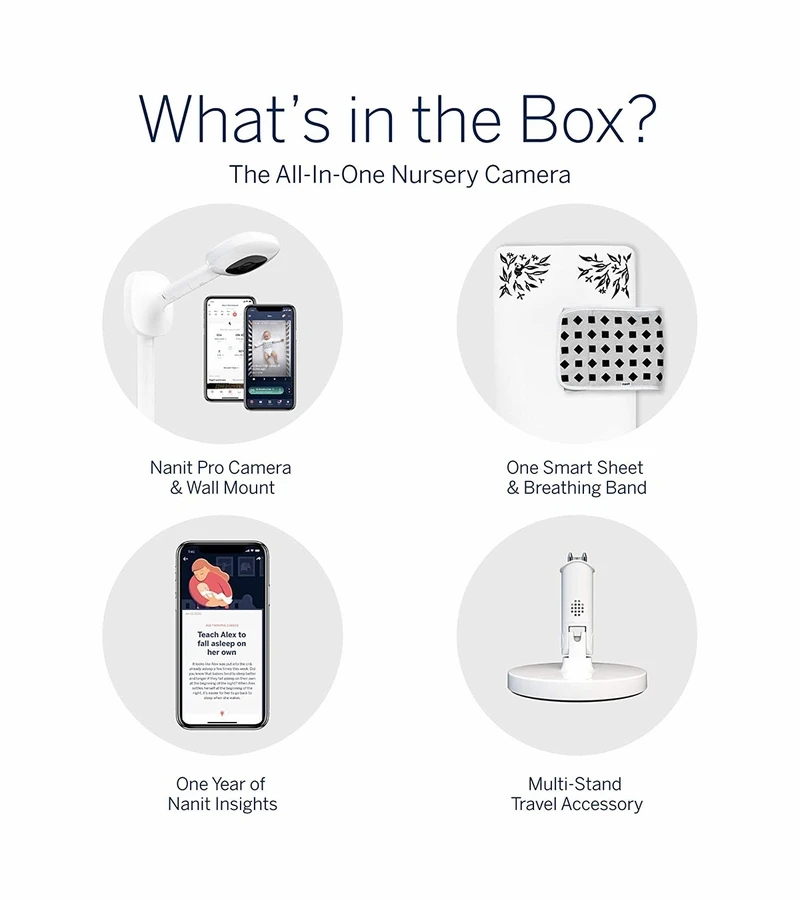 - Includes Nanit Pro Camera, Wall Mount, Small Breathing Band, Smart Sheet, Multi-Stand and one year of Nanit Insights