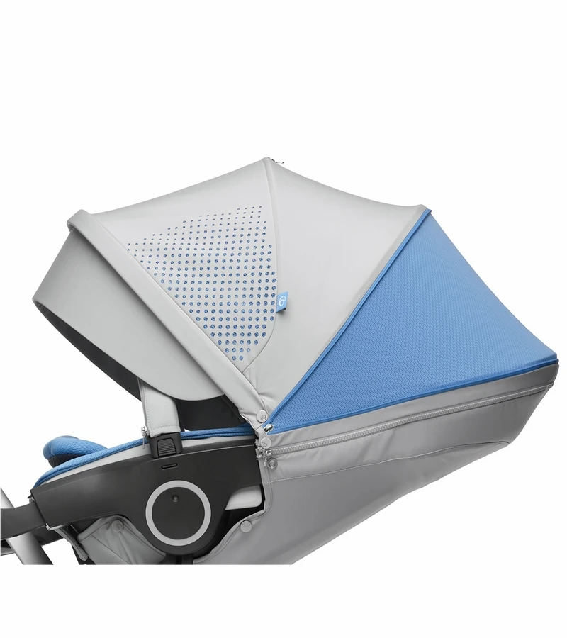 Enhanced Comfort The Xplory’s seat can recline to the perfect position in rear or parent facing modes. Laser cut perforation and mesh allow optimal ventilation, while an oversize canopy, with added extension, offers ultimate protection. |