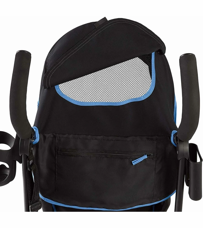 - Additional features: parent cup holder, cell phone holder, zip-close storage pocket, child sippy cup holder, compact fold with auto-lock and carry strap, anti-shock front wheels and lockable rear wheels